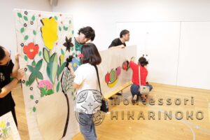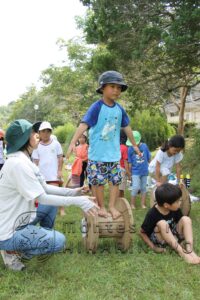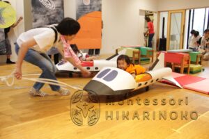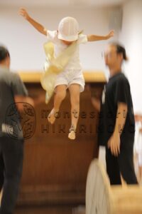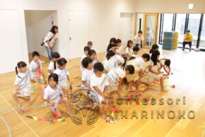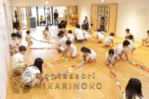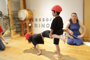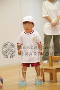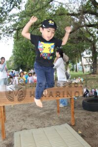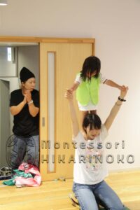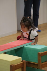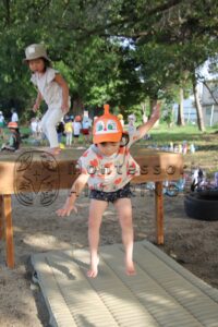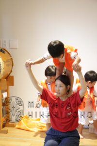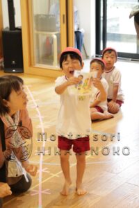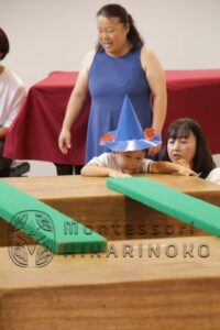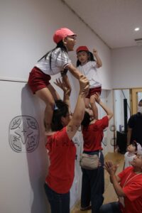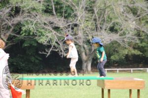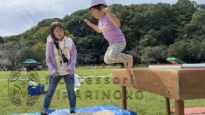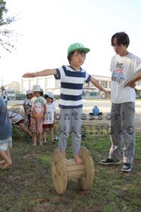 宇宙服に着替えた子どもたちが一本橋を乗り越え
