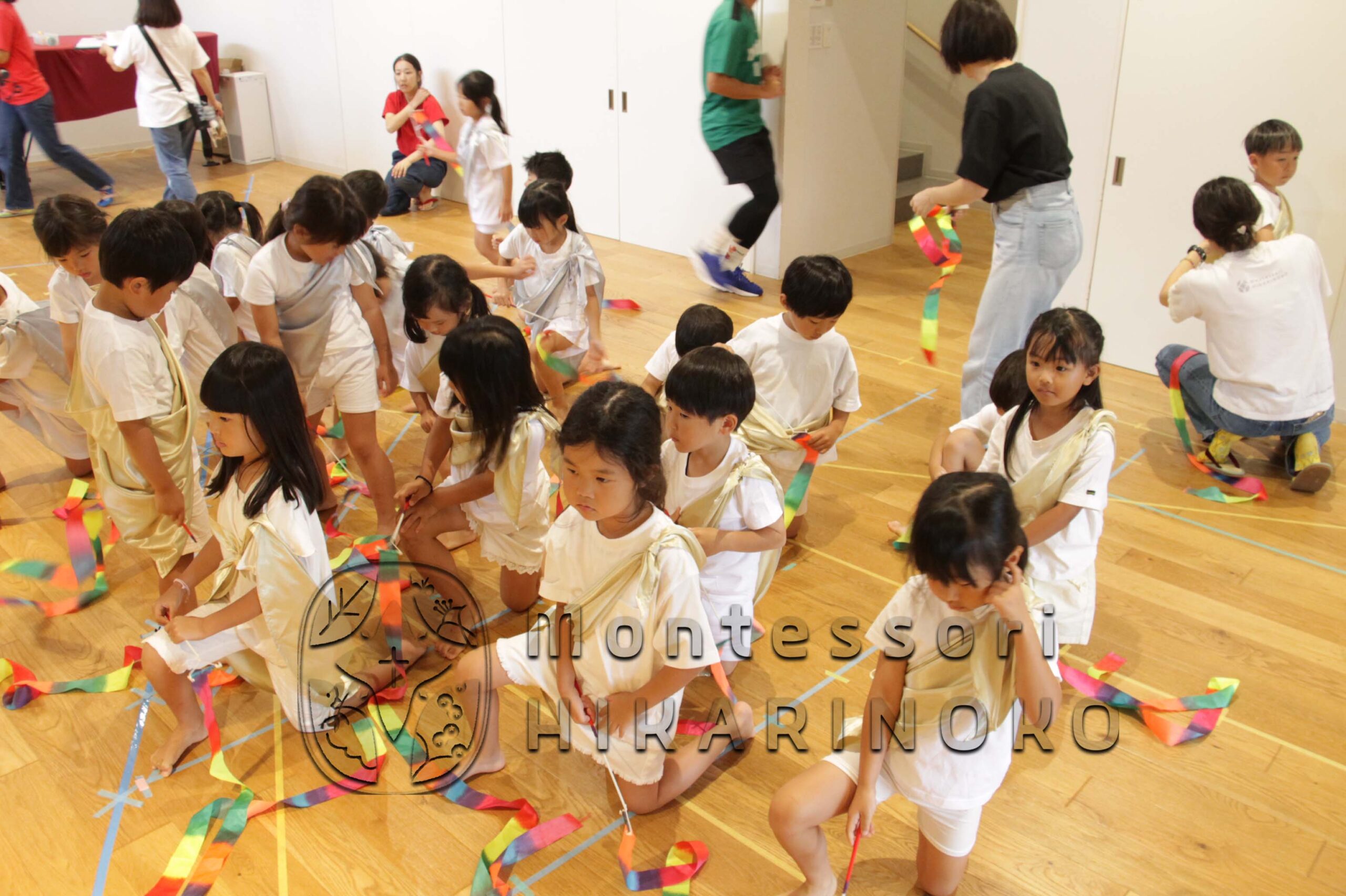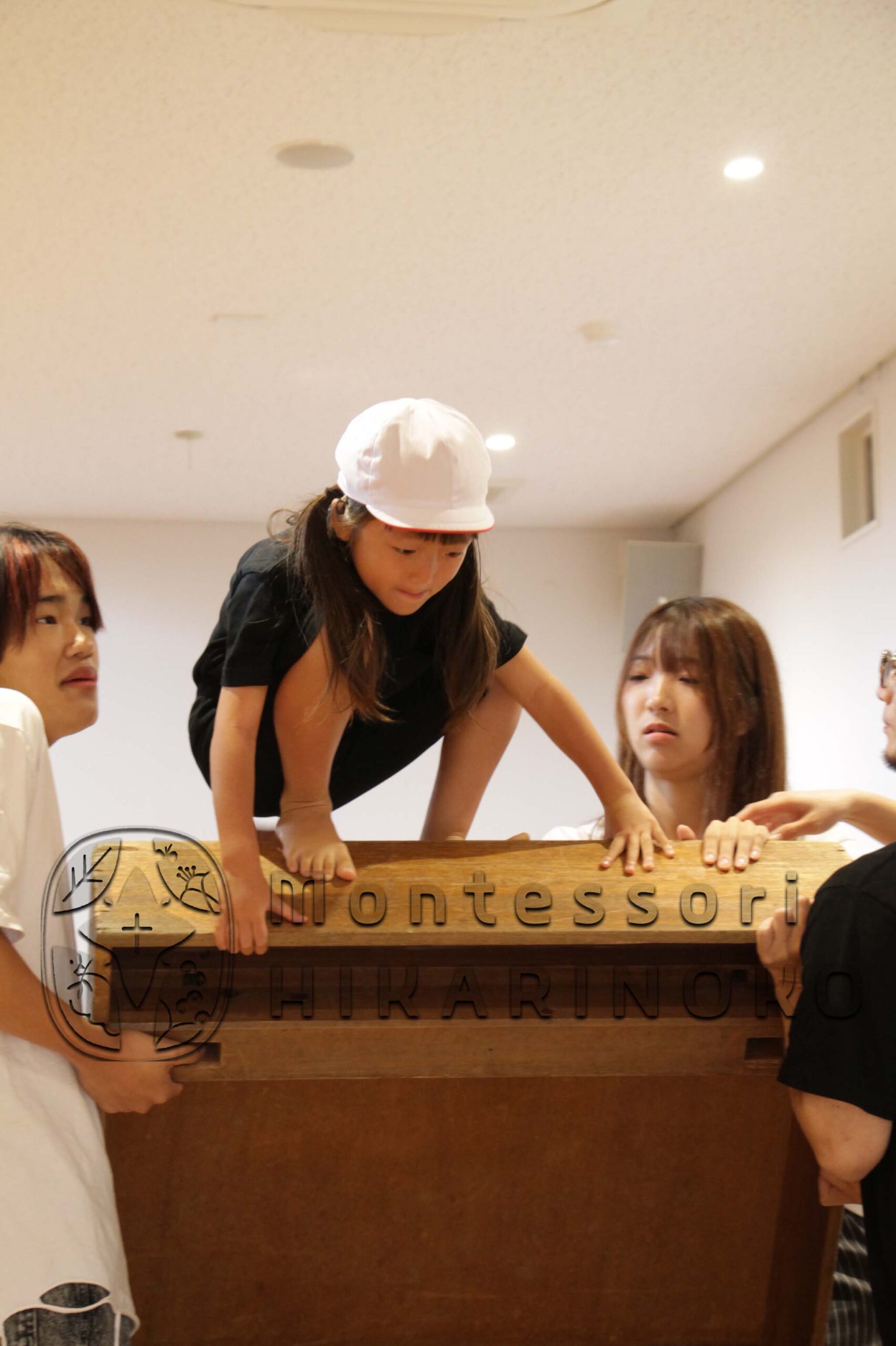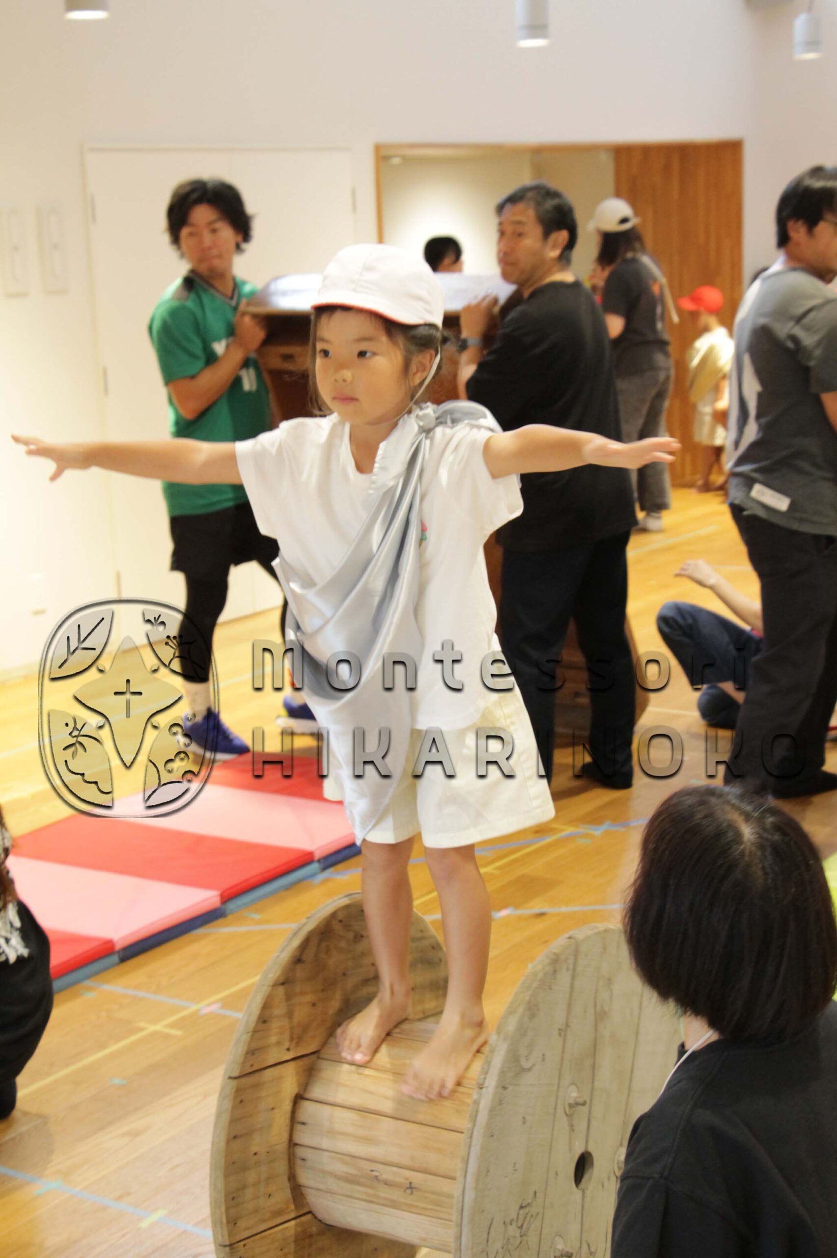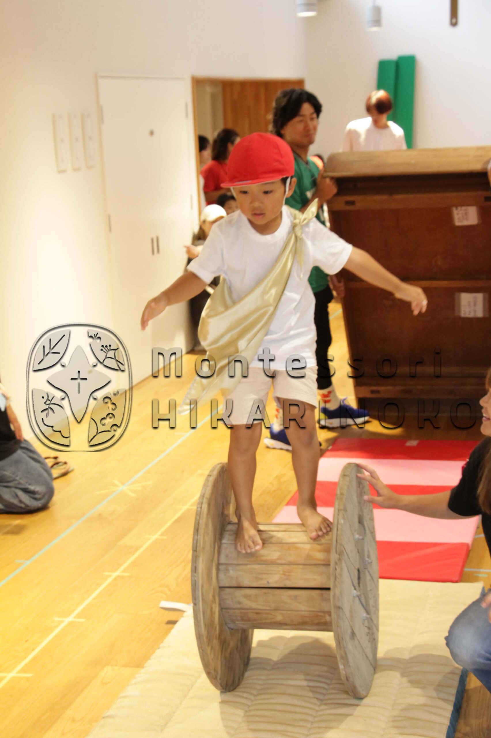 宇宙服に着替えた子どもたちが一本橋を乗り越え