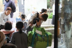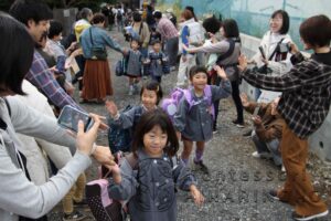 ご家族と一緒に大きな荷物を背負った子ども達が