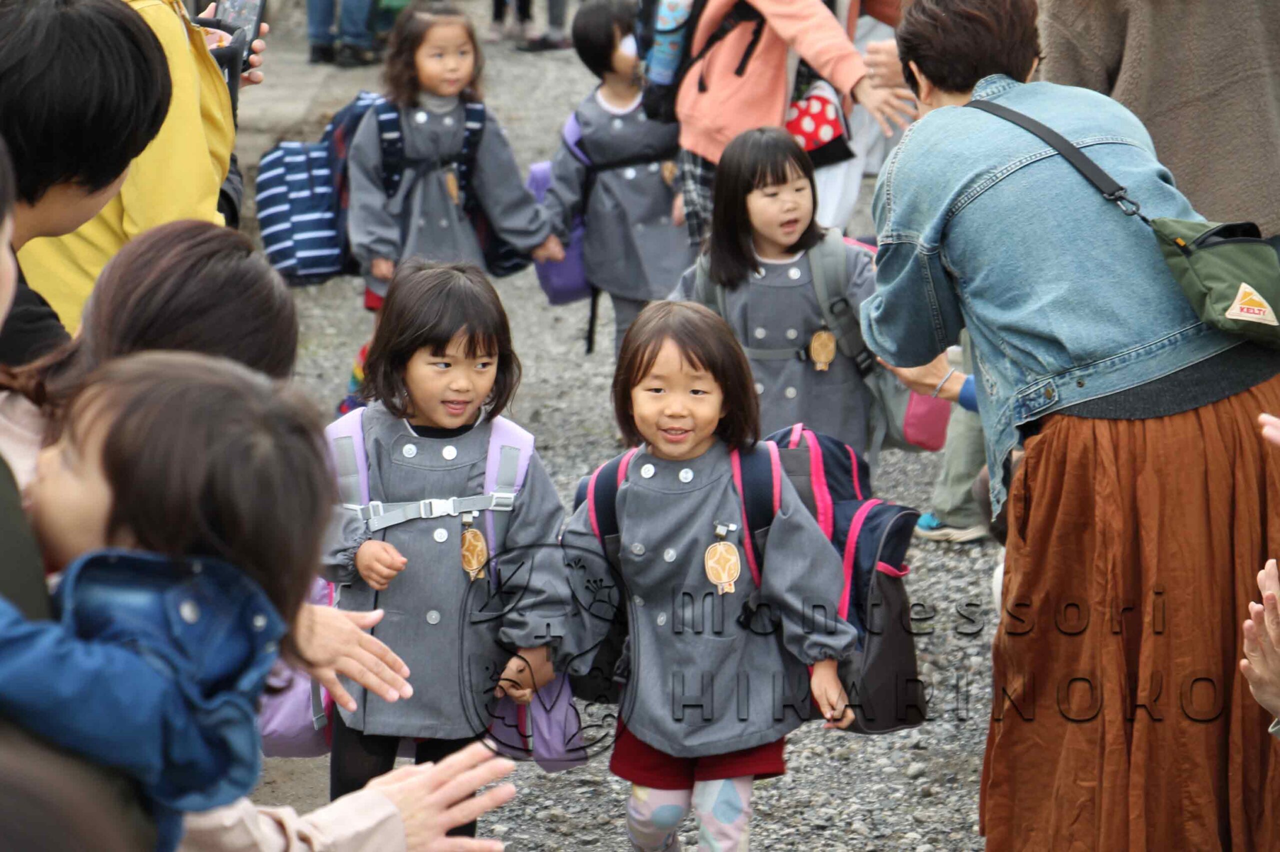 ご家族と一緒に大きな荷物を背負った子ども達が