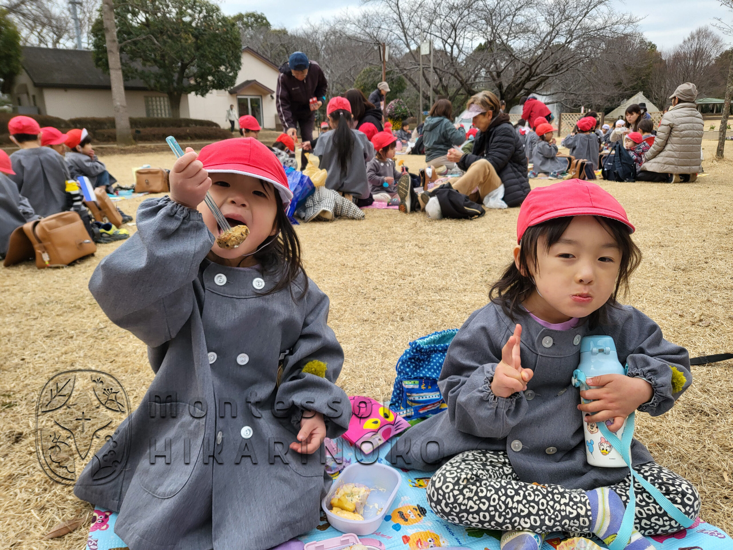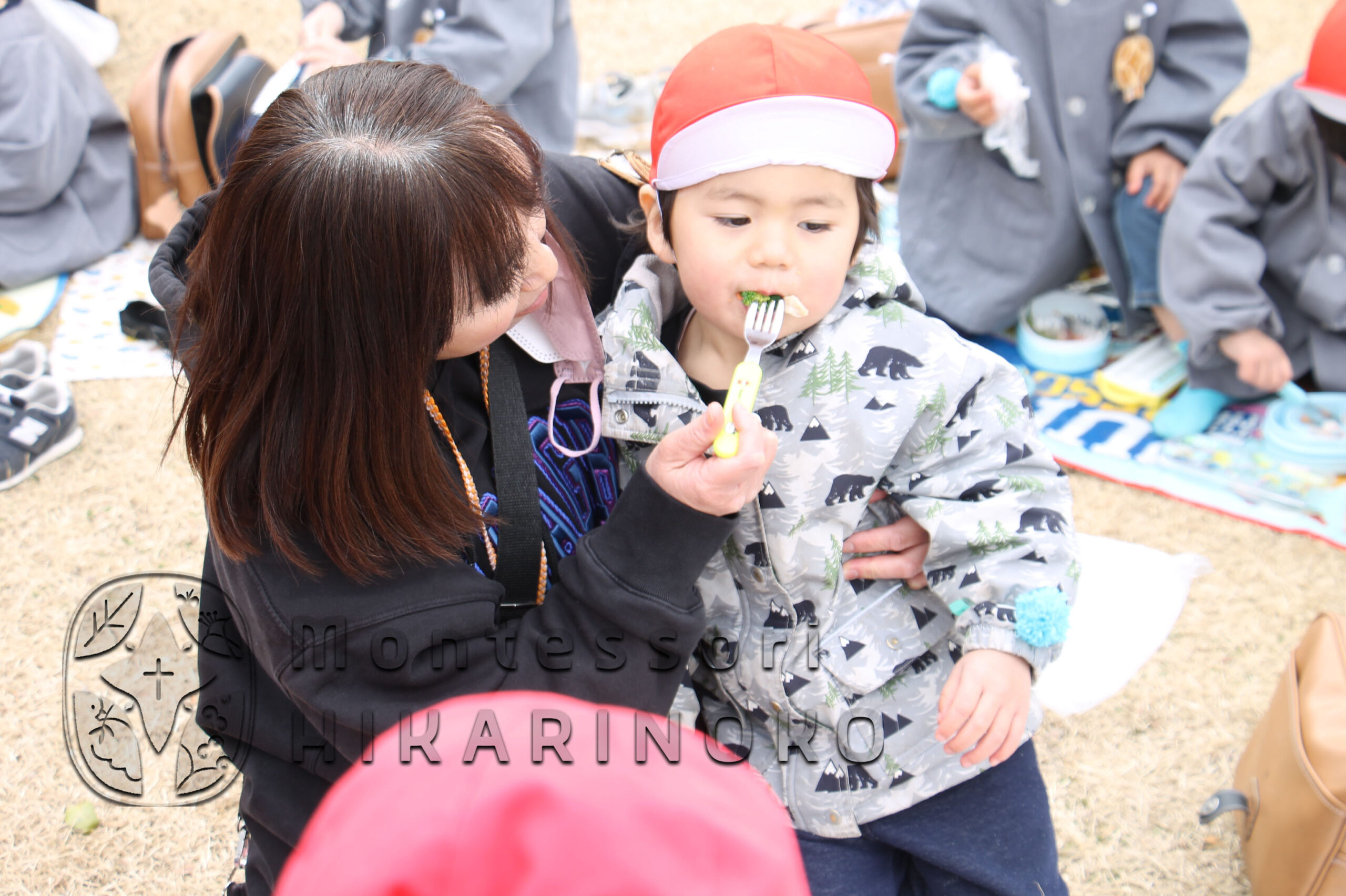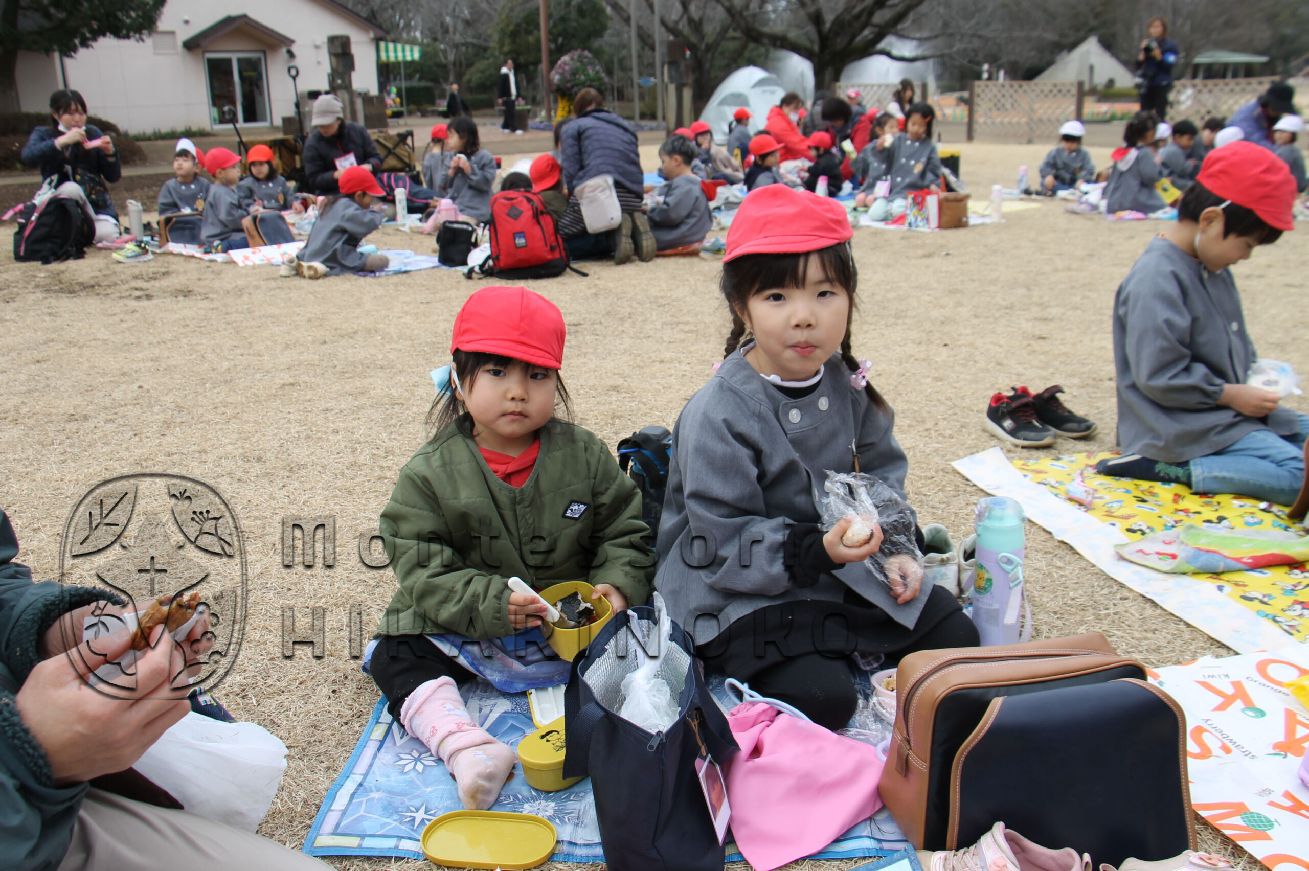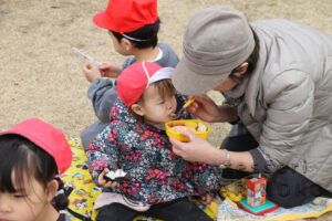 昼食時の場所取りチームとして園バスで